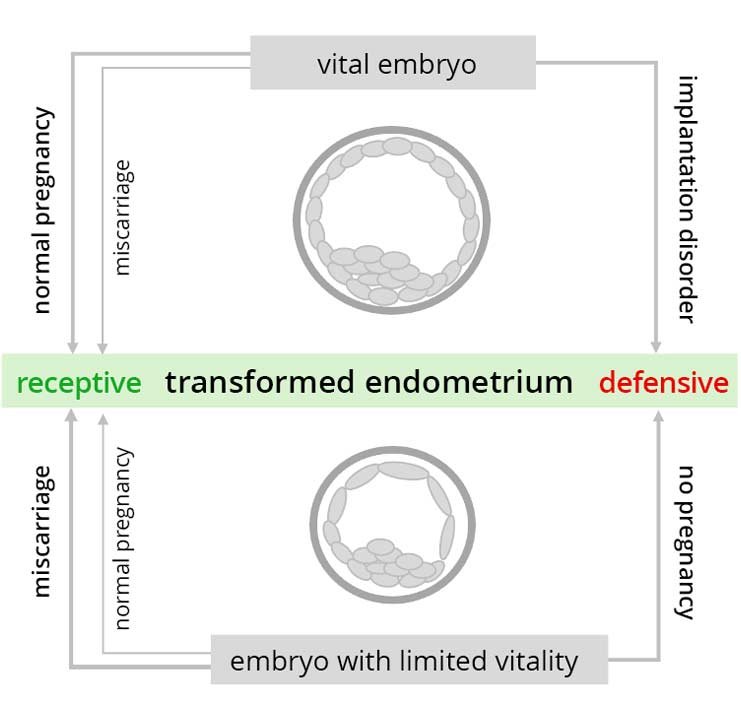 Şekil: Vital embriyo, olumsuz koşullarda bile (defansif endometrium) iyi yerleşme şansına sahiptir. Sınırlı vitaliteye sahip embriyonun başarılı bir gebelik için en iyi yerleşme koşullarına (reseptif endometrium) ihtiyacı vardır. İnsanlarda embriyoların çoğunun sınırlı bir canlılığa sahip olması normaldir.